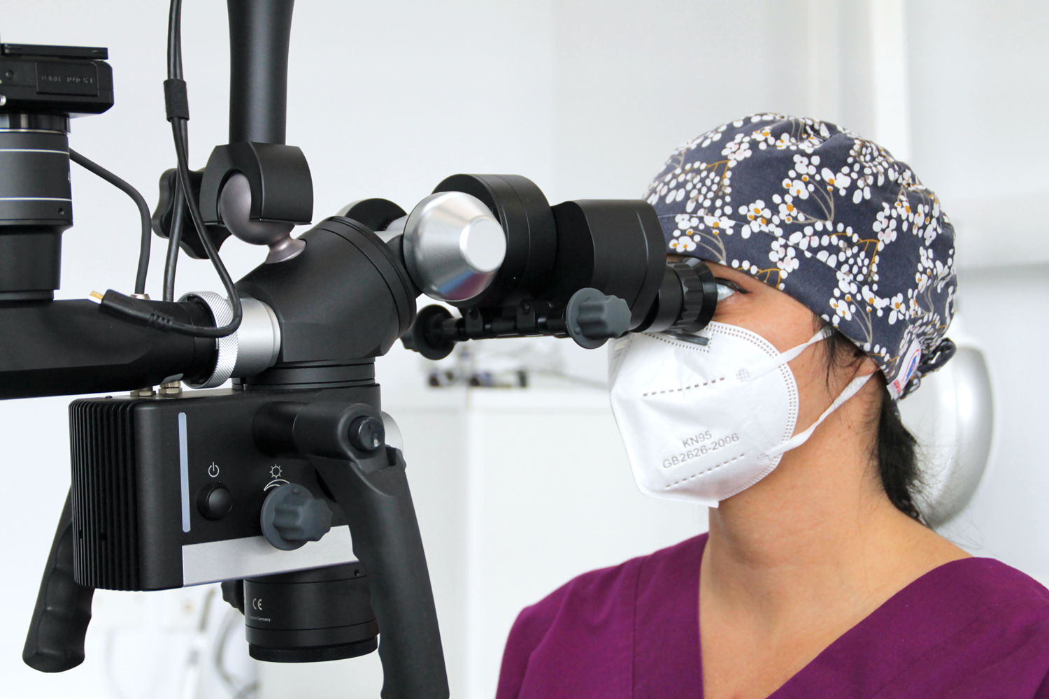 Certains actes peuvent être réalisés sous microscope afin d’assurer des soins les plus minutieux possible.